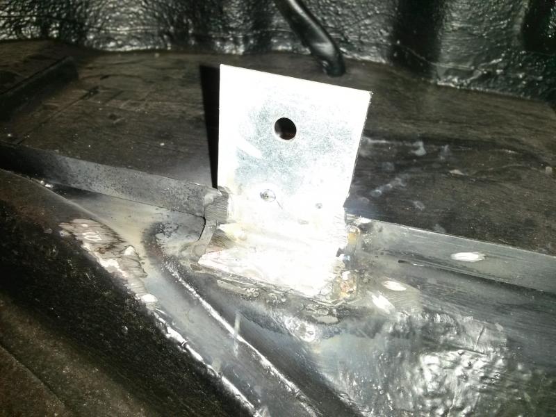 Anschließend ein Stück Blech geschnitten, gebohrt und eingebraten. Die Bohrung erhält dann noch eine schöne Schraube mit Plastik-Abstandhalter als "Haken" für den Spanngurt.