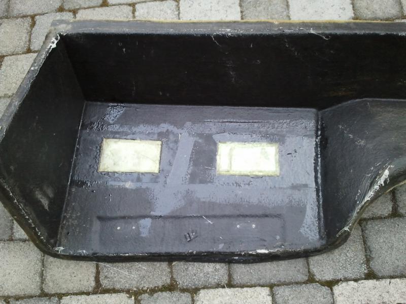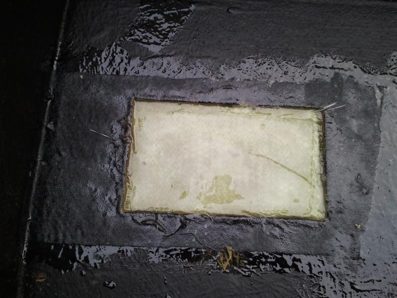 Dazu habe ich die Schadstellen komplett freigelegt, d.h. den Schaum an der Stelle mit dem Cutter entfernt und dann mit dem Styrodur aufgefüllt, dass ich eh von den Wandarbeiten übrig hatte. Anschliessend ein zwei drei Lagen Glasfasermatten mit Kunstharz aufgetragen und ein wenig mit Glasfaserpachtel beigearbeitet.