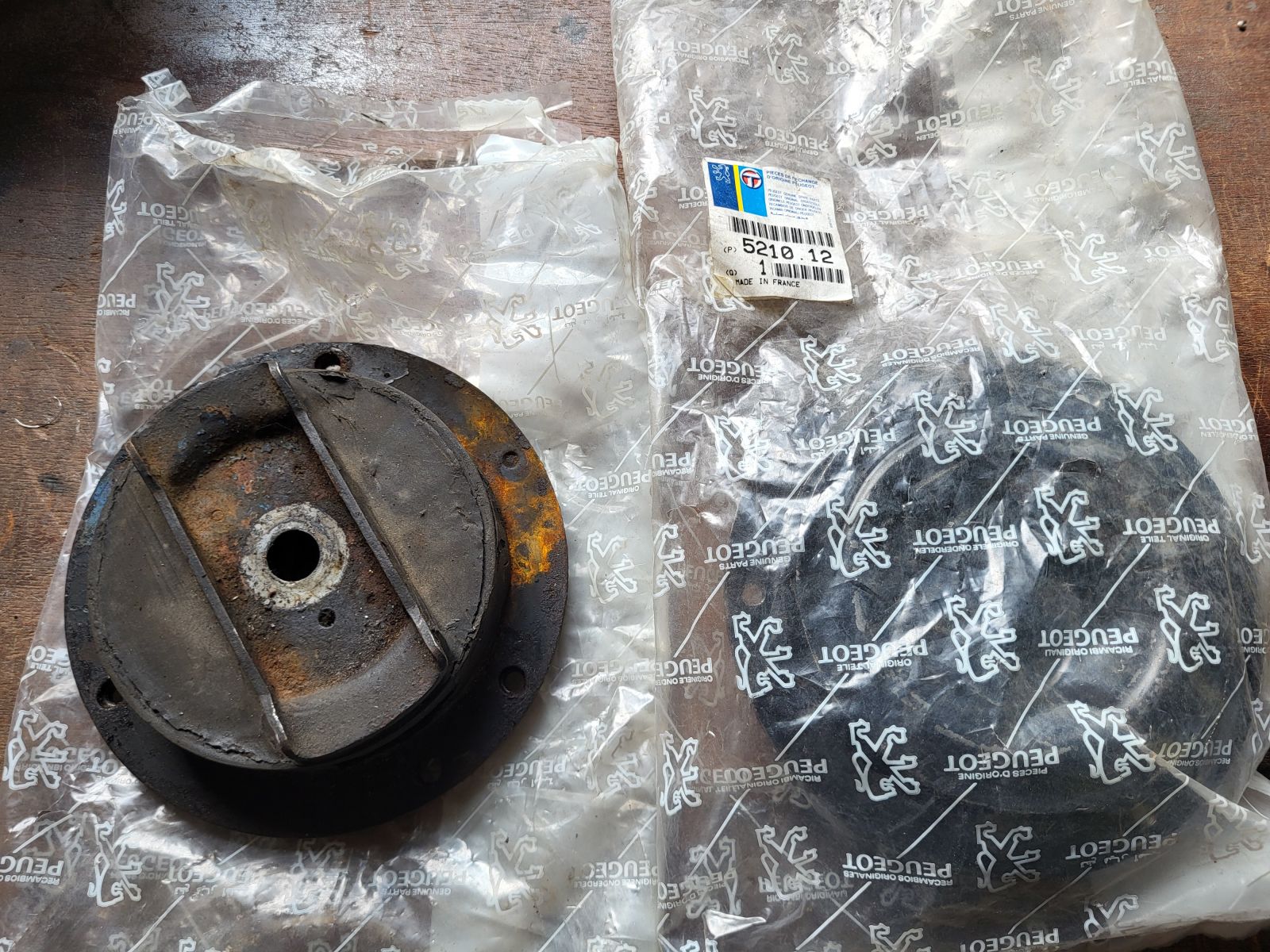 Anschließend noch den Dreieckslenker gelöst und - da sowieso auch dafür schon Teile hier lagen... - die obere Federbeinaufnahme gelöst. Vorher natürlich Federspanner angebracht, damit einem das nicht um die Ohren fliegt.